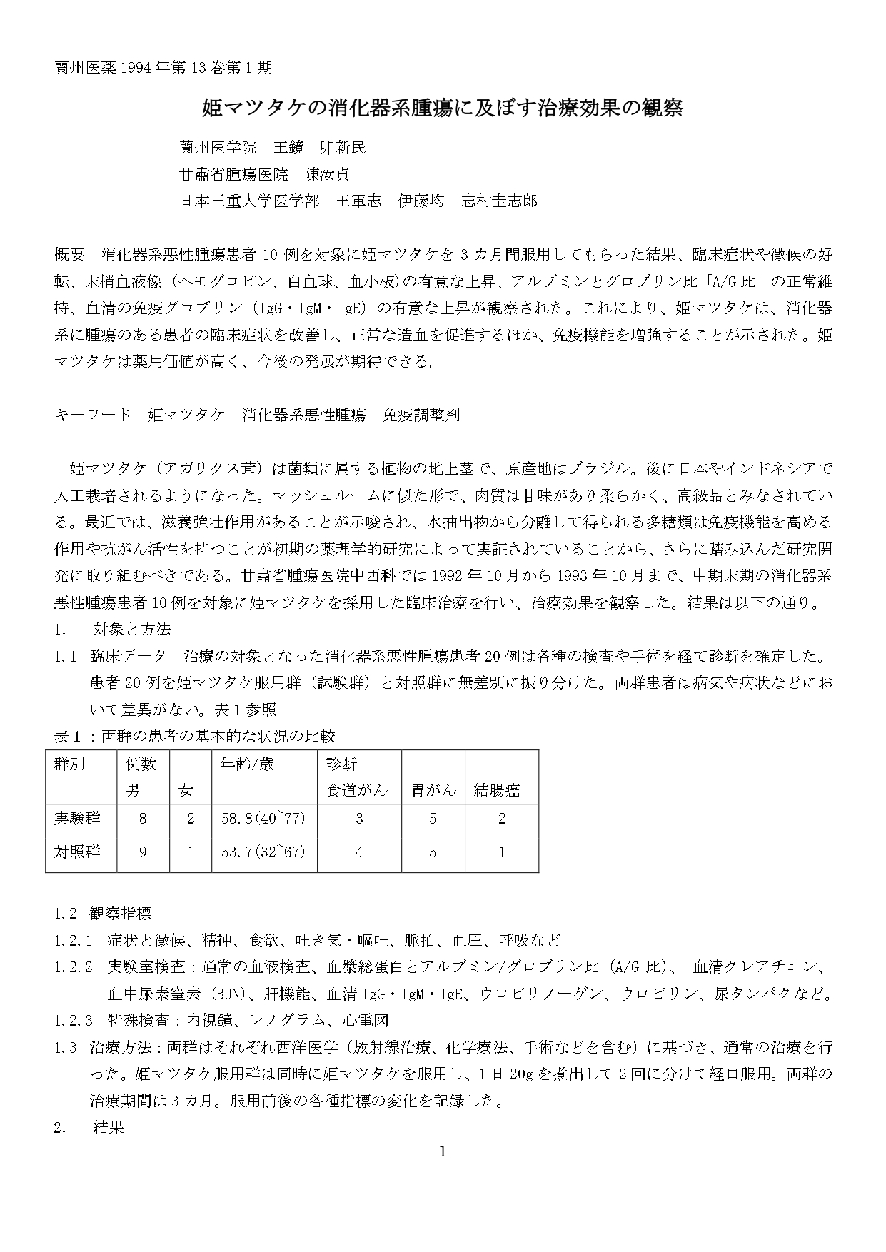 蘭州医学院 王鏡 卯新民、甘粛省腫瘍医院 陳汝貞、日本三重大学医学部 王軍使 伊藤均 志村圭志郎