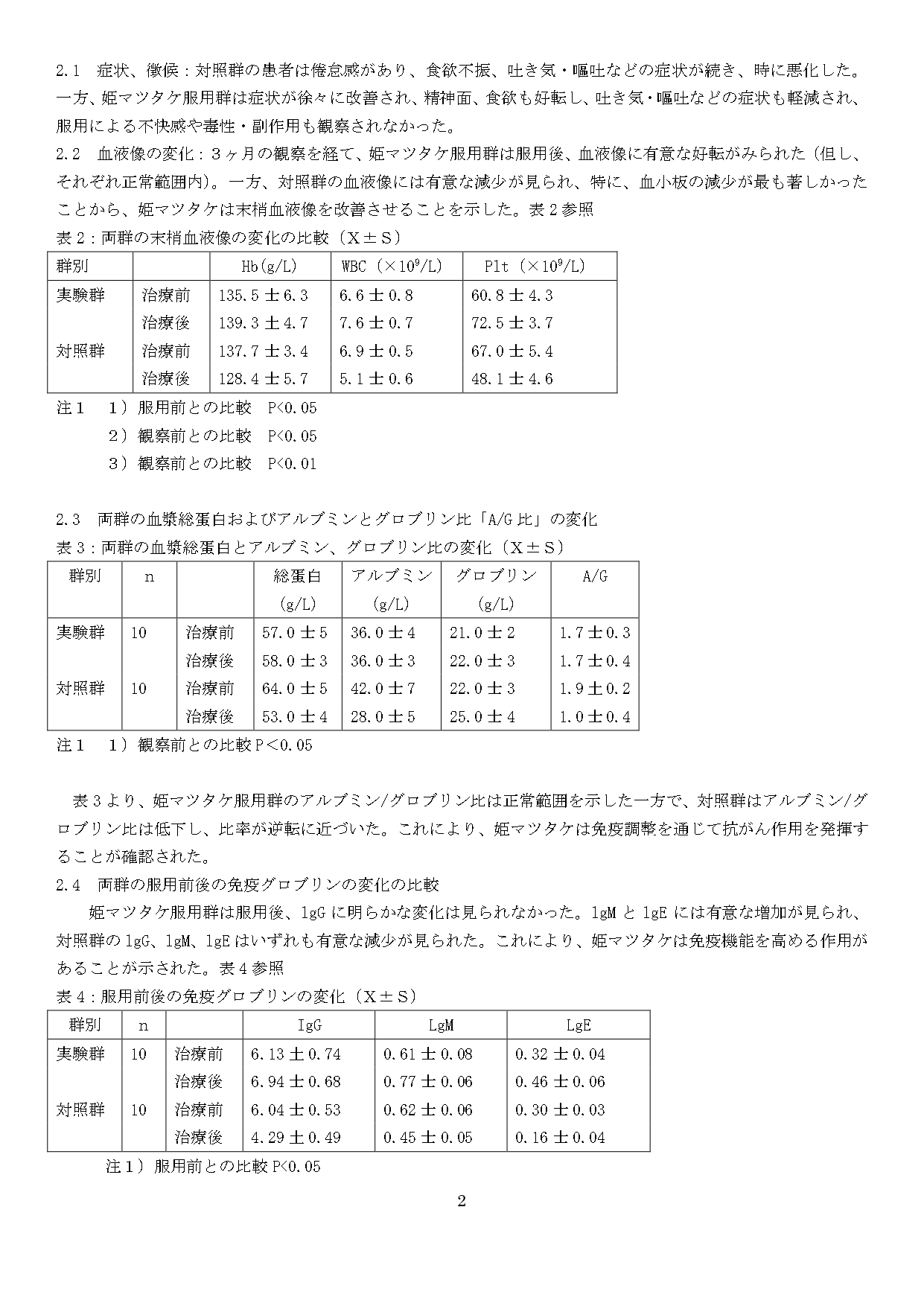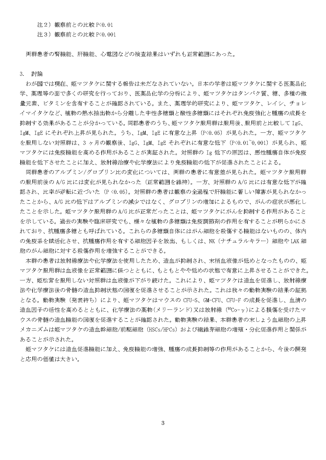 消化器系悪性がん患者(食道がん、胃がん、結腸がん)にヒメマツタケを3ケ月間飲んでもらった結果、ヒメマツタケは消化器系にがん腫瘍のある患者の症状を改善し、正常な造血を促進、免疫機能を増強することが分かった。
